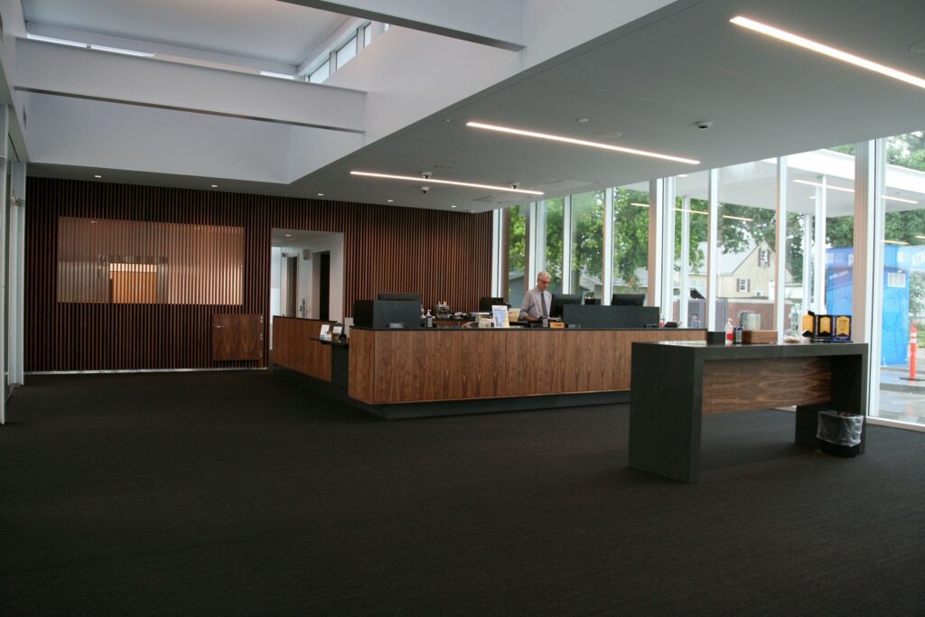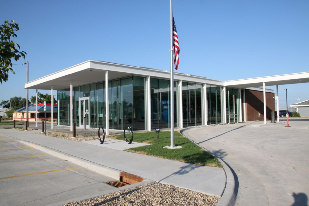 The Marion branch has concrete foundations, drywall ceilings, carpet, and LVT flooring. The exterior is made up of block, brick, Indiana limestone, and glass. Roof is EPDM and is covered with solar panels and the interior offices have full glass fronts. The building has a day lighting system that automatically adjusts the light level and window blinds. The bank has two drive-up teller lines and an ATM. This build models the latest branch design concepts including an expanded, open, and engaging space for clients; improved drive-thru accessibility, and lower emissions and overall environmental impact.